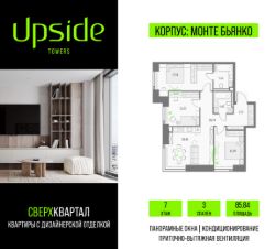 Продаётся 3-комнатная квартира площадью 85.84 кв.м на 7 этаже 46 этажного корпуса Монте Бьянко в квартале небоскребов "Upside Towers". Квартира с чистовой отделкой, c видом на Корпус Олимп, корпус Эльбрус, Бизнес-парк Останкино, прогулочный бульвар, детский сад, школу, Останкинскую Башню. Номер квартиры Г0713.