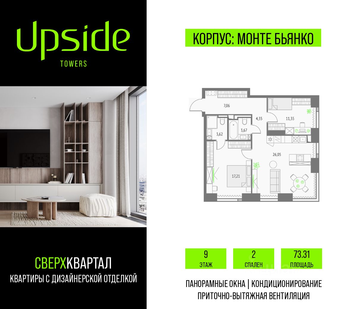 Upside Towers - технологичный квартал строится в динамично развивающемся Бутырском районе, в 3 мин. от метро, в 5 мин. от ТТК. На территории 7 га возводится 5 высотных башен от 19 до 58 этажей, названных в честь главных вершин земли. Квартиры с панорамными окнами в пол, высокими потолками и современными инженерными решениями. Благоустроенная зеленая территория включает: приватные дворы, природный комплекс, прогулочный бульвар, ландшафтный парк 2,5 га с сенсорным садом и многофункциональными игровыми и спортивными площадками.