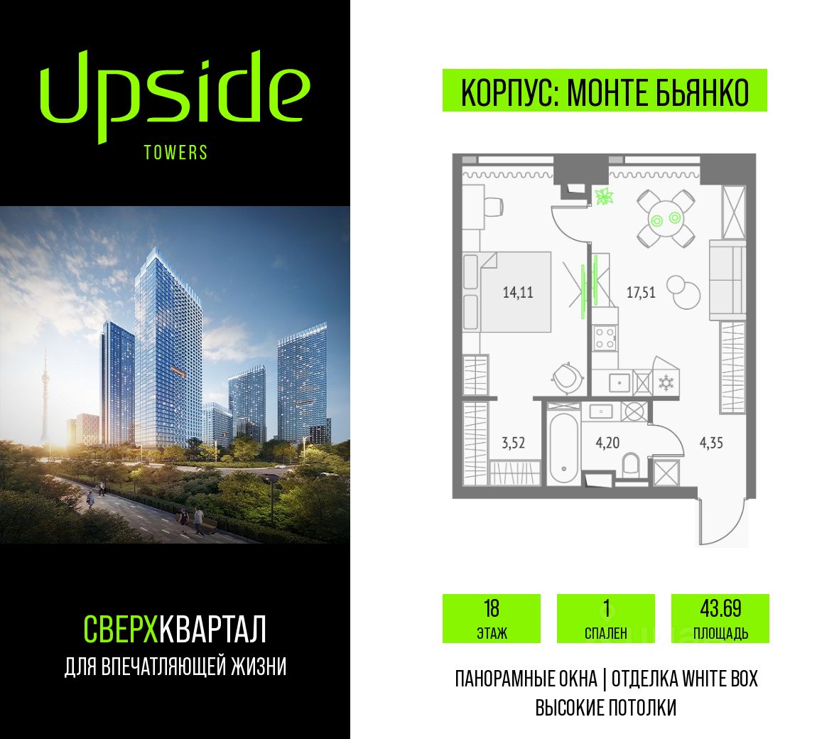 Продаётся 1-комнатная квартира площадью 43.69 кв.м на 20 этаже 46 этажного корпуса Монте Бьянко в квартале небоскребов "Upside Towers". В квартире отделка White-box, c видом на Звездный бульвар, Останкинскую Башню, ВДНХ. Номер квартиры Г2004.
