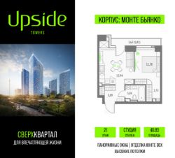 Продаётся студия площадью 40.83 кв.м на 21 этаже 46 этажного корпуса Монте Бьянко в квартале небоскребов "Upside Towers". В квартире отделка White-box, c видом на Звездный бульвар, Останкинскую Башню, ВДНХ. Номер квартиры Г2103.