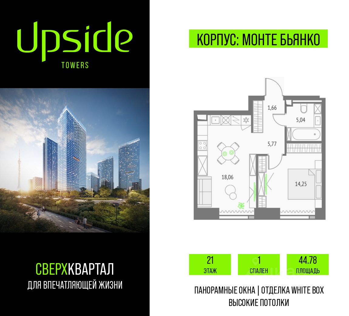 Продаётся 1-комнатная квартира площадью 44.78 кв.м на 21 этаже 46 этажного корпуса Монте Бьянко в квартале небоскребов "Upside Towers". В квартире отделка White-box, c видом на Внутренний двор, корпус Эверест , корпус Атлас, Ландшафтный парк. Номер квартиры Г2109.