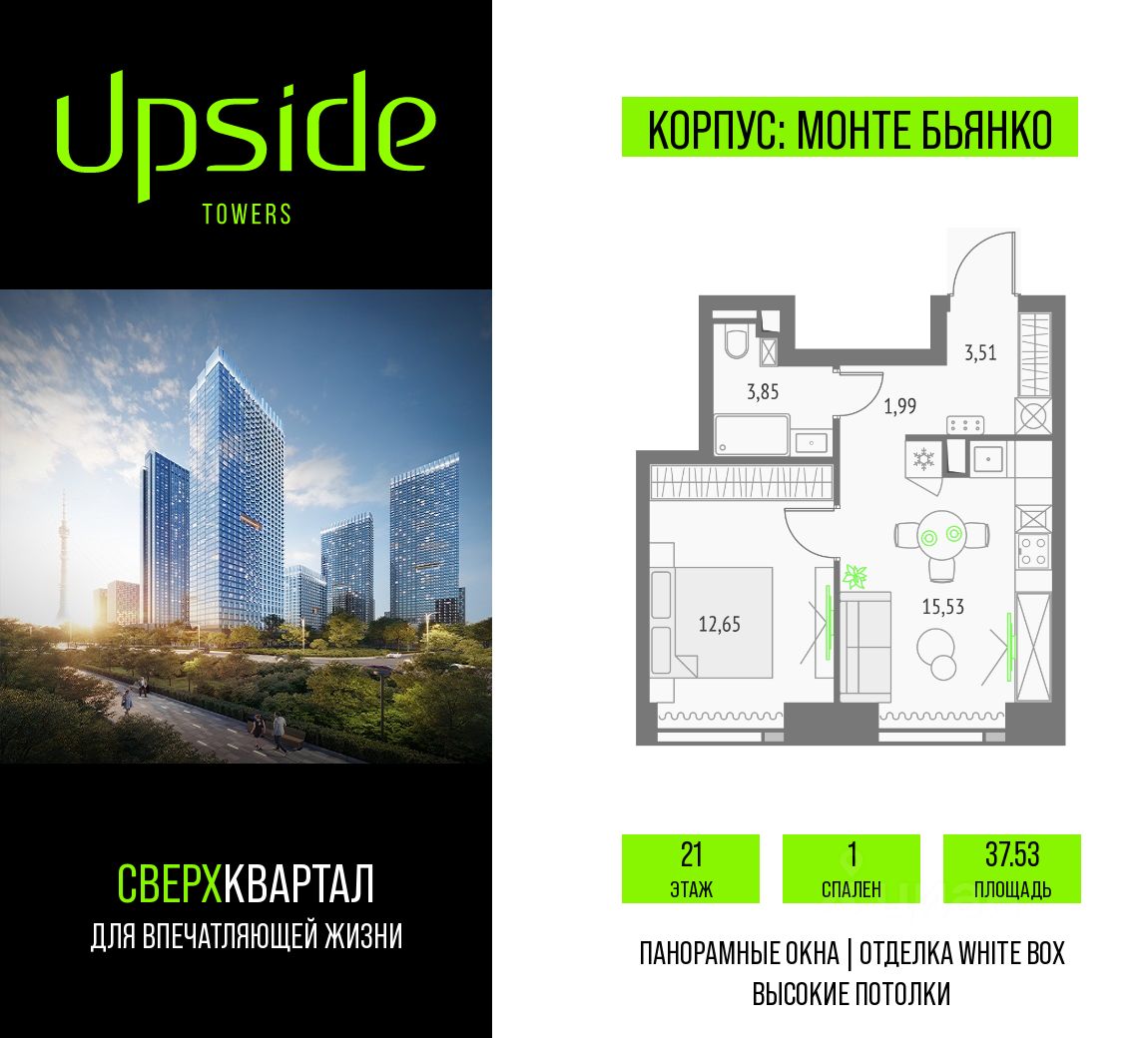 Продаётся 1-комнатная квартира площадью 37.53 кв.м на 21 этаже 46 этажного корпуса Монте Бьянко в квартале небоскребов "Upside Towers". В квартире отделка White-box, c видом на Внутренний двор, корпус Эверест , корпус Атлас, Ландшафтный парк. Номер квартиры Г2112.
