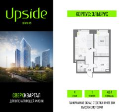 Продаётся 1-комнатная квартира площадью 40.4 кв.м на 4 этаже 55 этажного корпуса Эльбрус в квартале небоскребов "Upside Towers". В квартире отделка White-box, c видом на детский сад, БЦ Останкино. Номер квартиры А0403.