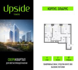 Продаётся 2-комнатная квартира площадью 67 кв.м на 4 этаже 55 этажного корпуса Эльбрус в квартале небоскребов "Upside Towers". В квартире отделка White-box, c видом на детский сад, БЦ Останкино. Номер квартиры А0405.