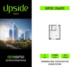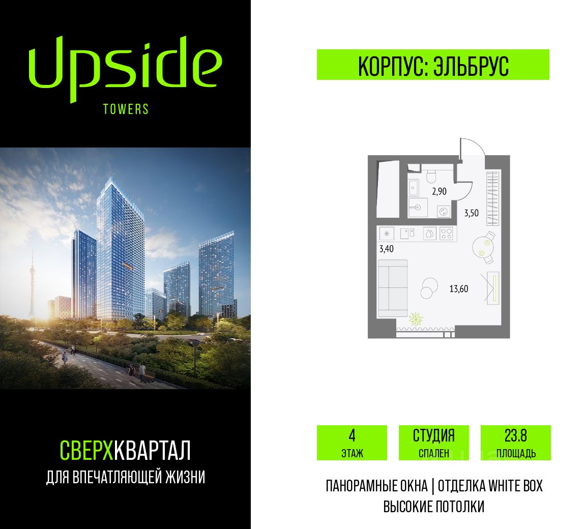 Продаётся студия площадью 23.8 кв.м на 4 этаже 55 этажного корпуса Эльбрус в квартале небоскребов "Upside Towers". В квартире отделка White-box, c видом на внутренний двор, прогулочный бульвар, 2 очередь. Номер квартиры А0414.