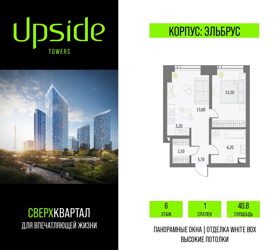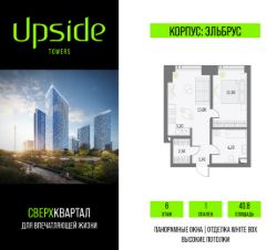 Продаётся 1-комнатная квартира площадью 40.8 кв.м на 6 этаже 55 этажного корпуса Эльбрус в квартале небоскребов "Upside Towers". В квартире отделка White-box, c видом на детский сад, БЦ Останкино. Номер квартиры А0603.