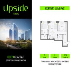 Продаётся 2-комнатная квартира площадью 67.6 кв.м на 6 этаже 55 этажного корпуса Эльбрус в квартале небоскребов "Upside Towers". В квартире отделка White-box, c видом на детский сад, БЦ Останкино. Номер квартиры А0605.