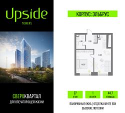 Upside Towers - технологичный квартал строится в динамично развивающемся Бутырском районе, в 3 мин. от метро, в 5 мин. от ТТК. На территории 7 га возводится 5 высотных башен от 19 до 58 этажей, названных в честь главных вершин земли. Квартиры с панорамными окнами в пол, высокими потолками и современными инженерными решениями. Благоустроенная зеленая территория включает: приватные дворы, природный комплекс, прогулочный бульвар, ландшафтный парк 2,5 га с сенсорным садом и многофункциональными игровыми и спортивными площадками.