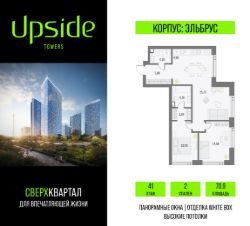 Продаётся 2-комнатная квартира площадью 70.9 кв.м на 41 этаже 55 этажного корпуса Эльбрус в квартале небоскребов "Апсайд Тауэрс", в квартире предчистовая отделка, c видом на останкинскую башню, ботанический сад, ВДНХ, парк Сокольники. Номер квартиры А4108.
