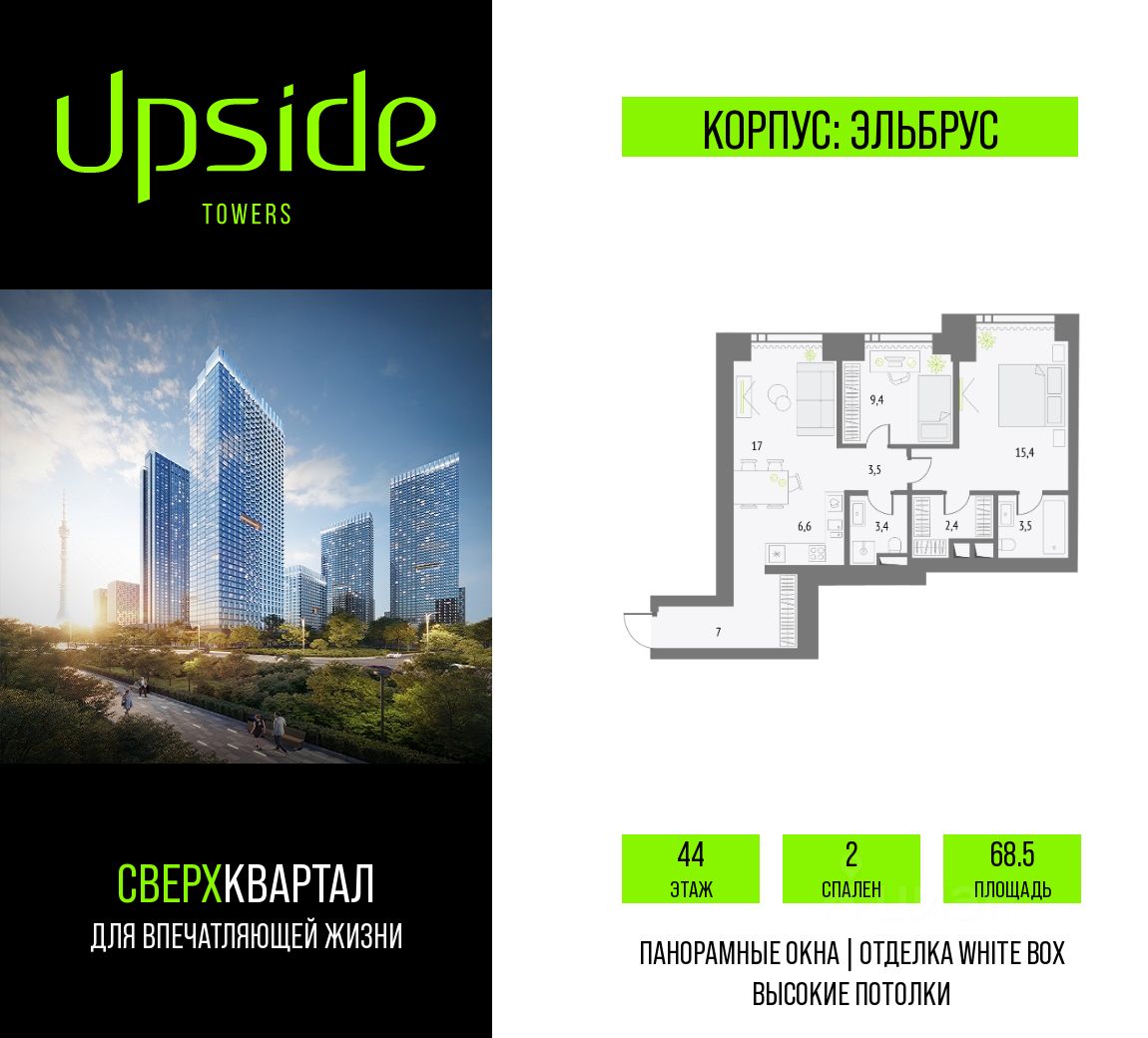 Upside Towers - технологичный квартал строится в динамично развивающемся Бутырском районе, в 3 мин. от метро, в 5 мин. от ТТК. На территории 7 га возводится 5 высотных башен от 19 до 58 этажей, названных в честь главных вершин земли. Квартиры с панорамными окнами в пол, высокими потолками и современными инженерными решениями. Благоустроенная зеленая территория включает: приватные дворы, природный комплекс, прогулочный бульвар, ландшафтный парк 2,5 га с сенсорным садом и многофункциональными игровыми и спортивными площадками.