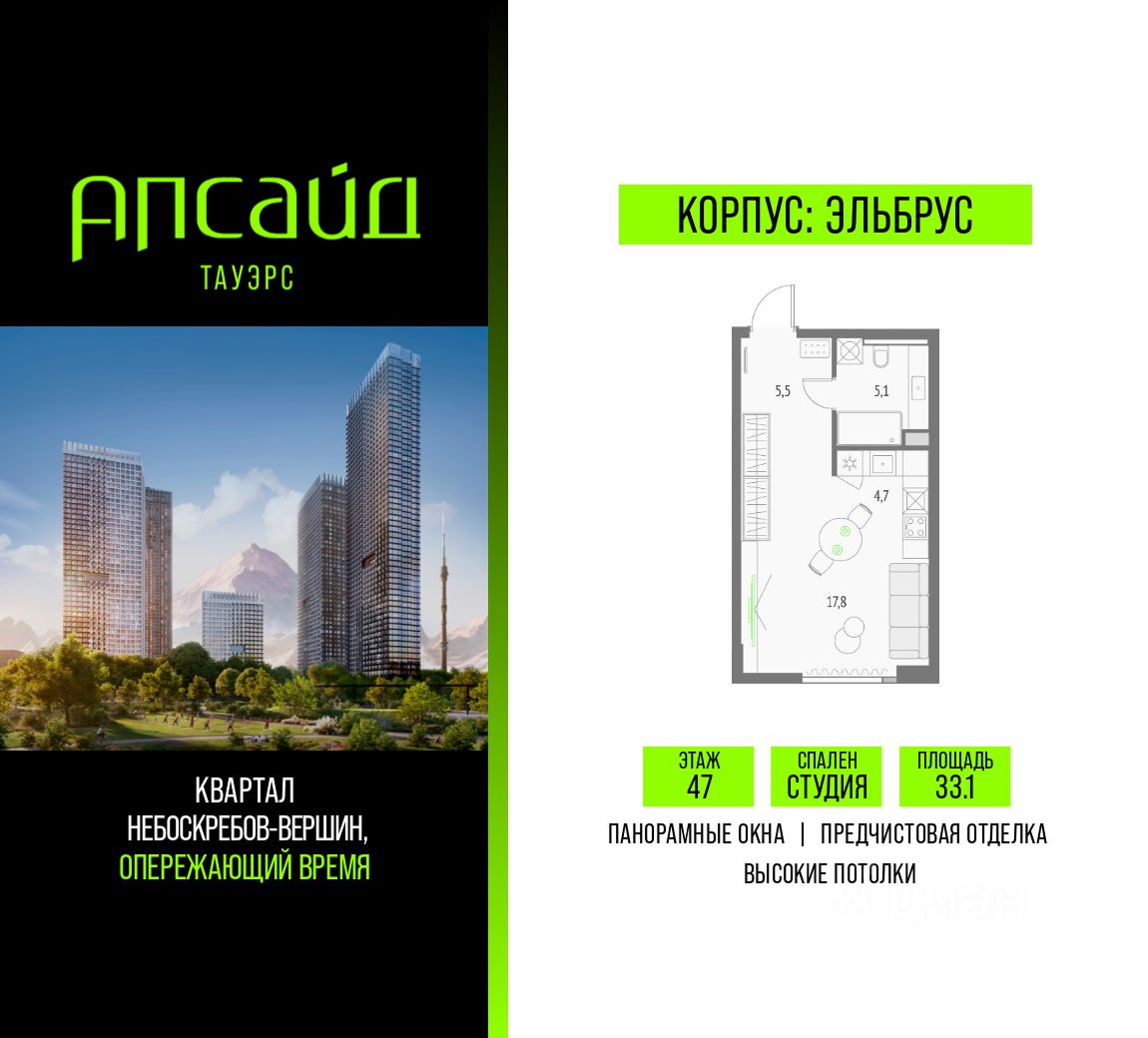 Продаётся студия площадью 33.1 кв.м на 47 этаже 55 этажного корпуса Эльбрус в квартале небоскребов "Апсайд Тауэрс". В квартире предчистовая отделка,с видом на 2 очередь, прогулочный бульвар, парк Сокольники. Номер квартиры А4709.
