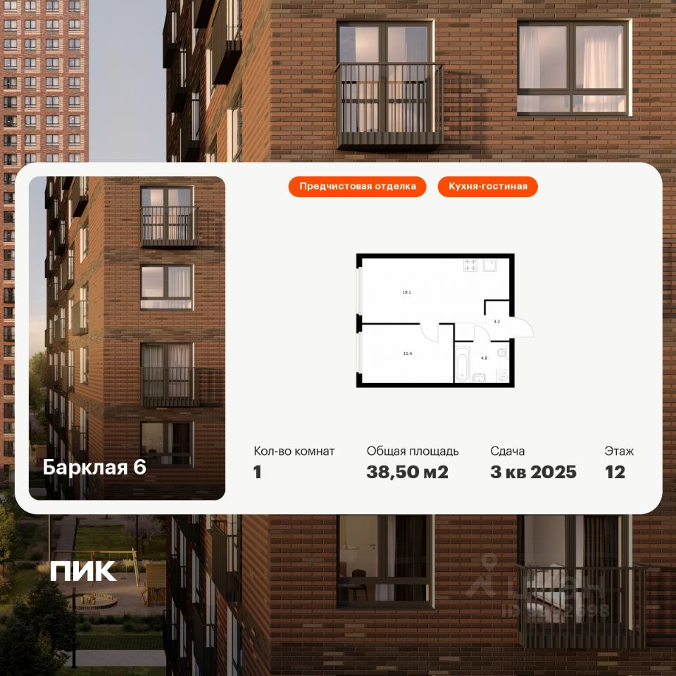 Продаётся 1-комн. квартира площадью 38,5 кв.м на 12 этаже 32 этажного дома (Корпус 7, Секция 2) проекта ПИК Барклая 6. Светлый просторный подъезд на уровне земли, функциональная планировка, большие окна, предчистовая отделка.