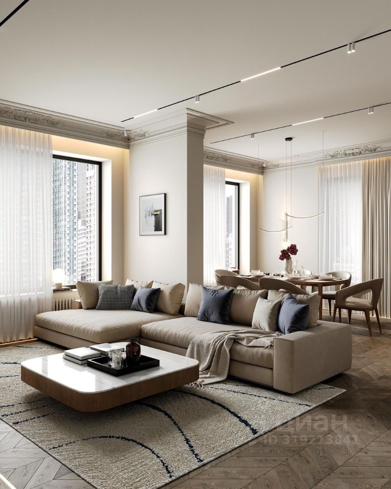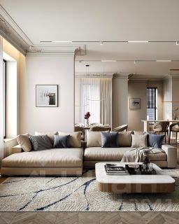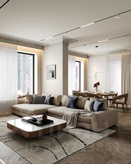 • Просторная гостиная с большими окнами наполняет квартиру естественным светом и создает ощущение уюта. Здесь найдется место для отдыха, работы и приема гостей.