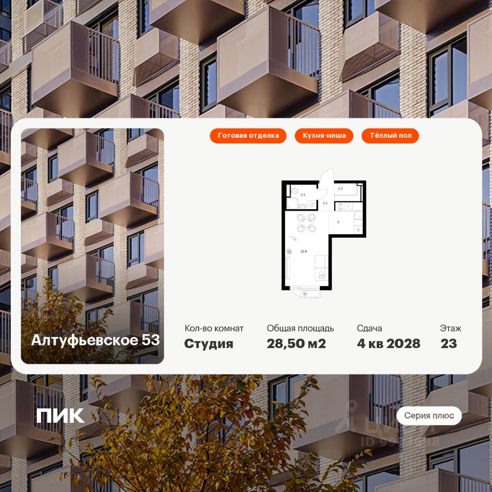 Продаётся квартира-студия площадью 28,5 кв.м на 23 этаже 32 этажного дома (Корпус 1.1, Секция 2) проекта ПИК Алтуфьевское 53. Светлый просторный подъезд на уровне земли, функциональная планировка, большие окна, c отделкой.