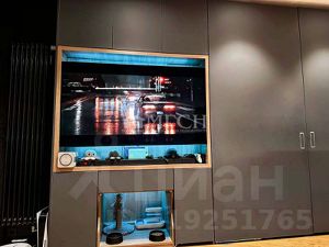 За телевизором расположены глубокие скрытые шкафы, где установлена приставка и один из трёх мощных роутеров. Также выведено оптоволокно, скорость интернета максимально возможная на сегодняшний день.