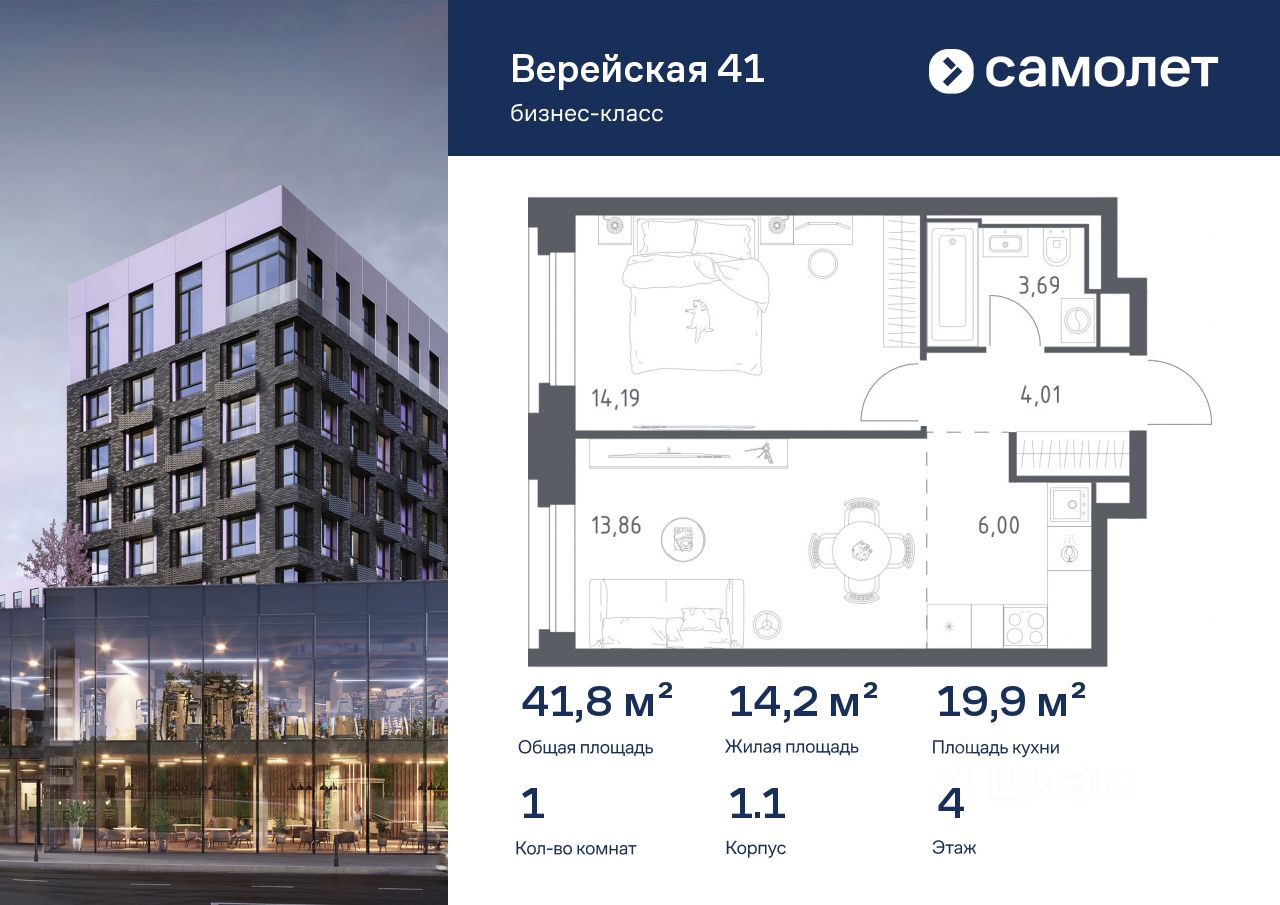Предлагается 1-комнатная квартира бизнес-класса 41,75 кв.м в корпусе 1.1 на 4 этаже, в "Верейская 41"