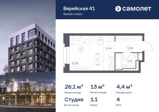 Предлагается квартира студия бизнес-класса 26,06 кв.м в корпусе 1.1 на 4 этаже, в "Верейская 41"
