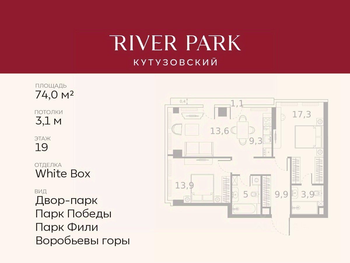 Продается 2-к квартира площадью 74.0 кв.м. на 19-м этаже в жилом комплексе премиум-класса River Park Кутузовский в Башне Emerald Tower