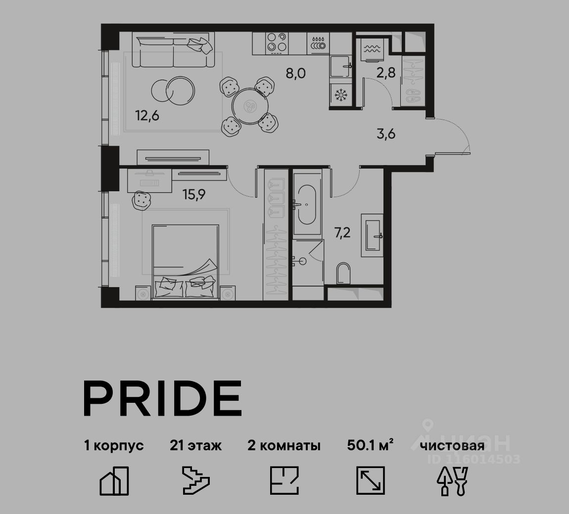 В премиальном жилом квартале PRIDE продается 2-комнатная квартира в 1 корпусе, на 21 этаже, в секции 9. Её общая площадь составляет 50.1 м². Пространство включает 1 уютную спальню 15,9 м², просторную кухню-гостиную 20,6 м² и ванную комнату 7,2 м². В квартире будет выполнена дизайнерская отделка, представленная двумя стилистическими решениями на выбор. Ключи в 2026 году.