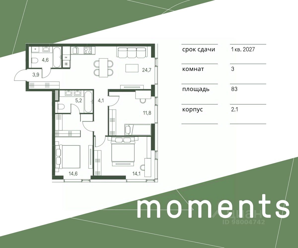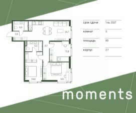 Продается 3-к. квартира номер 295 общей площадью 83 кв.м. на 24-м этаже 30 этажного дома, корпус 2.1. С отделкой White Box.