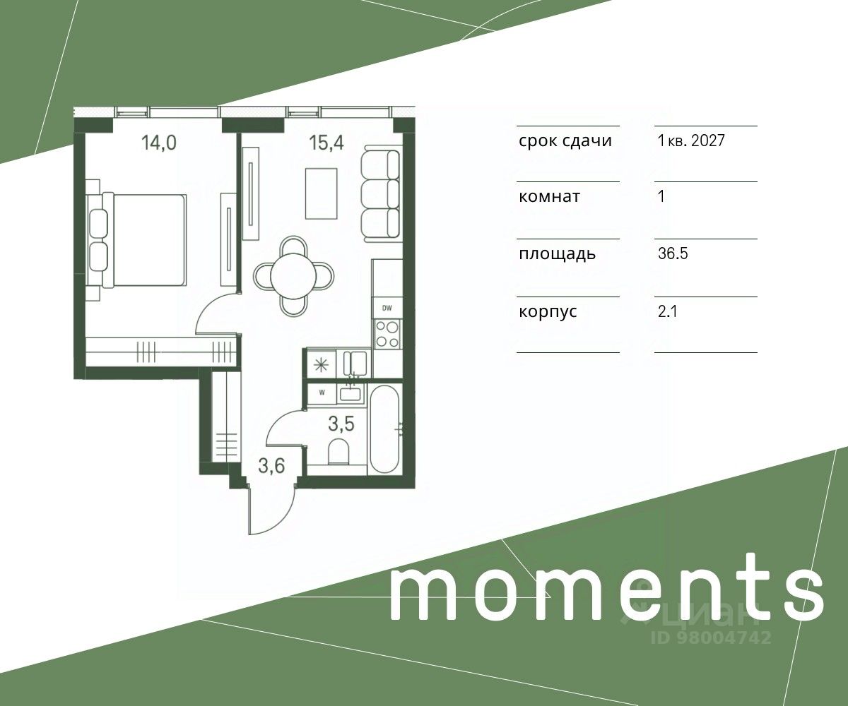 Продается 1-к. квартира номер 326 общей площадью 36.5 кв.м. на 26-м этаже 30 этажного дома, корпус 2.1. С отделкой White Box.