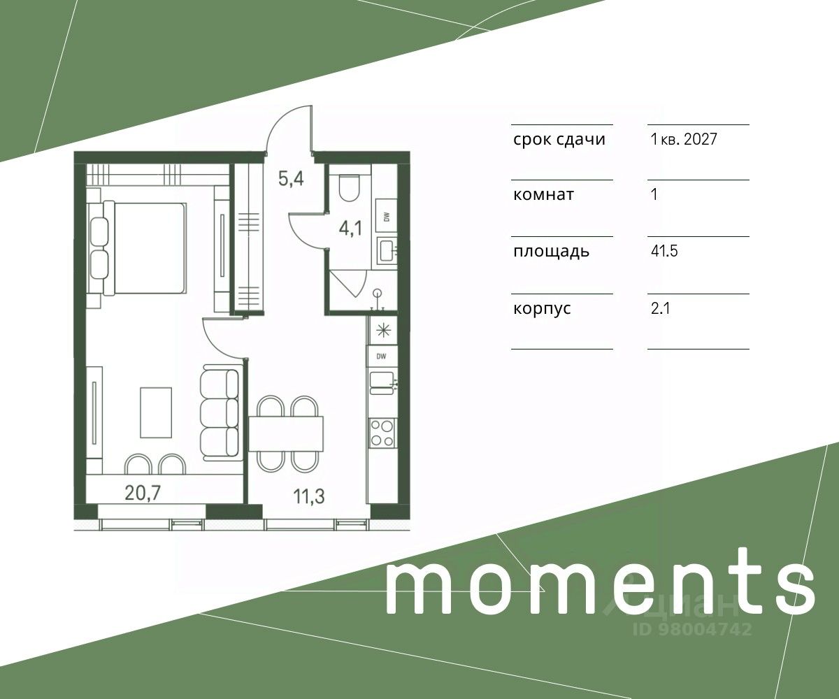 Продается 1-к. квартира номер 249 общей площадью 41.5 кв.м. на 20-м этаже 30 этажного дома, корпус 2.1. С отделкой White Box.