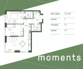 Продается 2-к. квартира номер 632 общей площадью 71.1 кв.м. на 20-м этаже 40 этажного дома, корпус 2.3. С отделкой White Box.