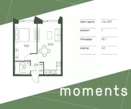Продается 1-к. квартира номер 1175 общей площадью 42.7 кв.м. на 22-м этаже 34 этажного дома, корпус 2.2. С отделкой White Box.