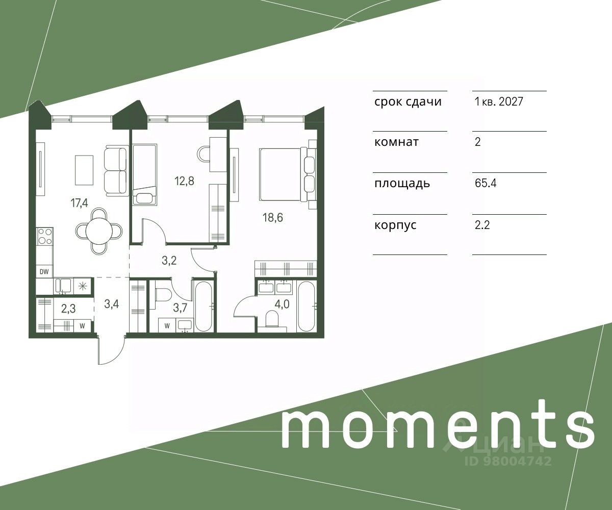 Продается 2-к. квартира номер 1258 общей площадью 65.4 кв.м. на 28-м этаже 34 этажного дома, корпус 2.2. С отделкой White Box.