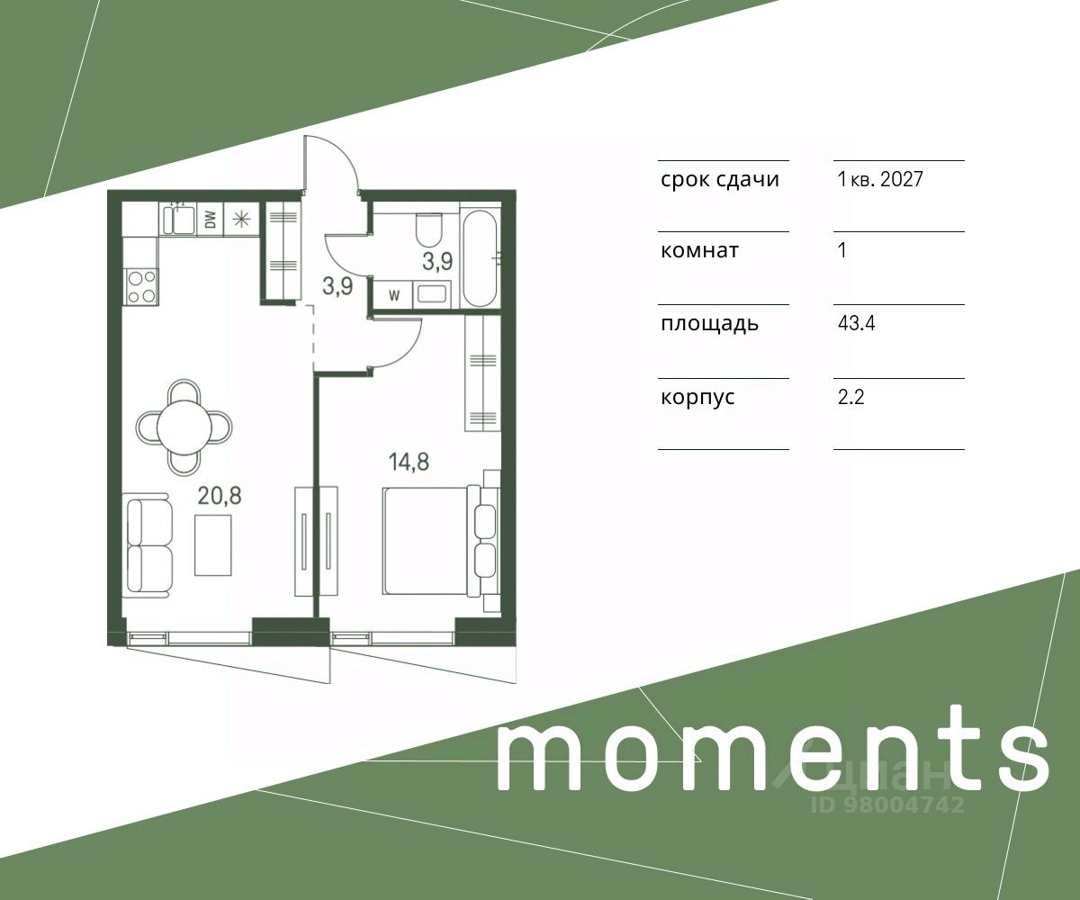 Продается 1-к. квартира номер 1198 общей площадью 43.4 кв.м. на 24-м этаже 34 этажного дома, корпус 2.2. С отделкой White Box.