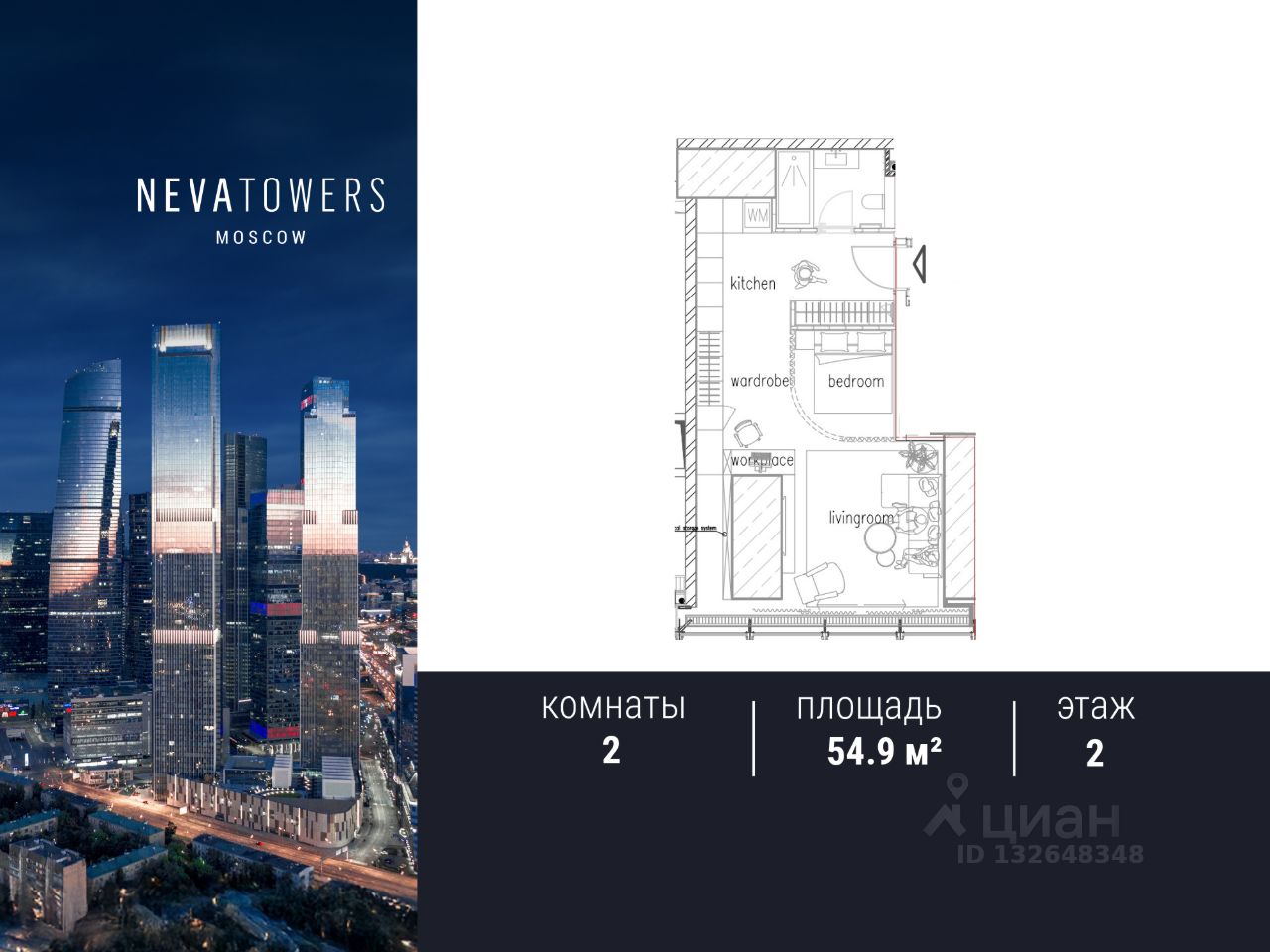 Площадь — 54,9 м², 2 этаж, вид на башни Сити. Отлично подойдёт как под личное проживание, так и под формат Home Office.