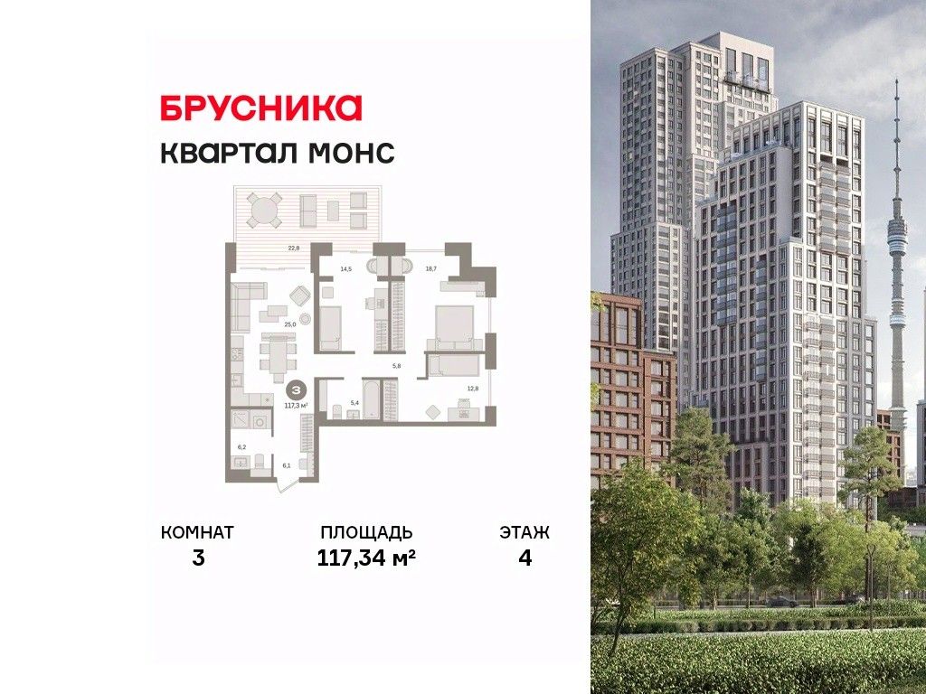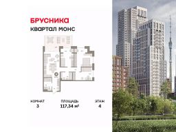 Квартира с кухней-гостиной и тремя спальнями в квартале "МОНС". Особенности планировки: второй санузел, окна в пол, без отделки, панорамное остекление, терраса, терраса на крыше.