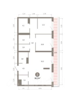 Квартира с кухней-гостиной и двумя спальнями в квартале "МОНС". Особенности планировки: гардеробная, без отделки, мастер-спальня, постирочная, терраса на крыше.