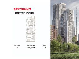 Квартира с кухней-гостиной и тремя спальнями в квартале "МОНС". Особенности планировки: балкон, без отделки, второй санузел, гардеробная, мастер-спальня, окна в пол, панорамное остекление, разнесённые спальни, терраса, терраса на крыше.