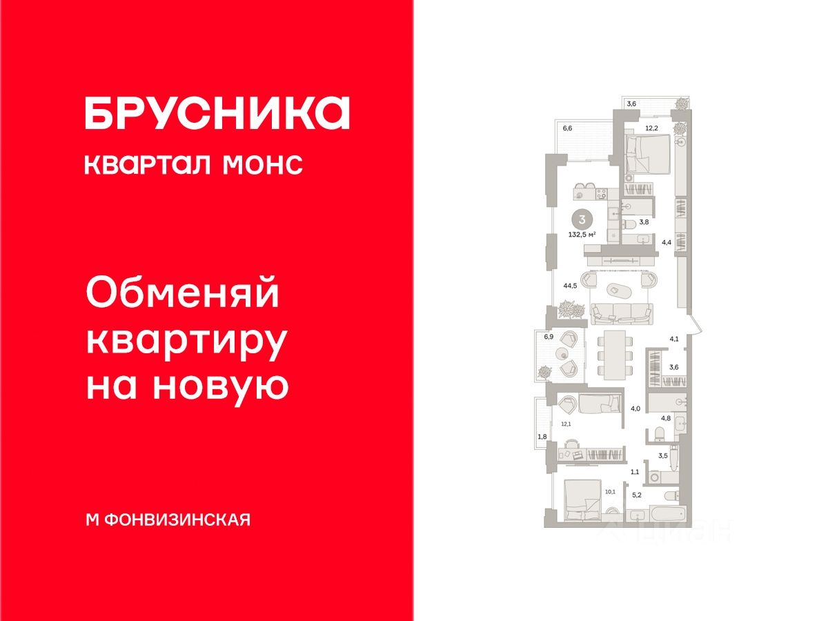 В проекте доступна программа обмена: мы выкупим вашу старую квартиру, направим средства на оплату новой и сопроводим сделку. Доступны опции: проживание до 30 месяцев, закрытие ипотеки, выделение детских долей, получение средств на ремонт. квартиры в нашей базе: МОН01-Ж3.15.6.