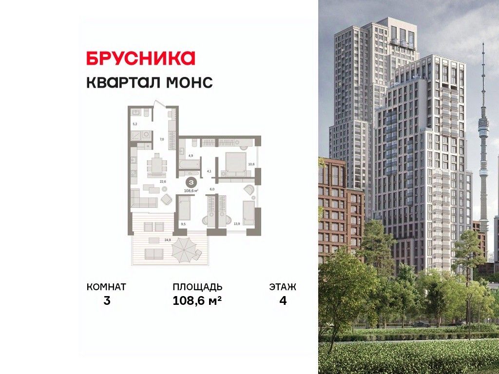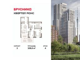 Квартира с кухней-гостиной и тремя спальнями в квартале "МОНС". Особенности планировки: второй санузел, окна в пол, без отделки, панорамное остекление, терраса на крыше.
