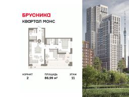 Квартал "МОНС" пронизан атмосферой локации, её энергетикой. Она воплощена в общей композиции, чистоте её форм, в графичных и динамичных силуэтных линиях. Пять домов от 2 до 45 этажеи поддерживают идею монументальности и одновременной лёгкости, но при этом у каждого из них сформировался свой характер. "Игра" с разными высотами, текстурой и формой фасадов позволила запустить в квартиры и дворы больше света, сделать пространства между домами проницаемыми и воздушными. Застройщик — компания Брусника.