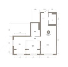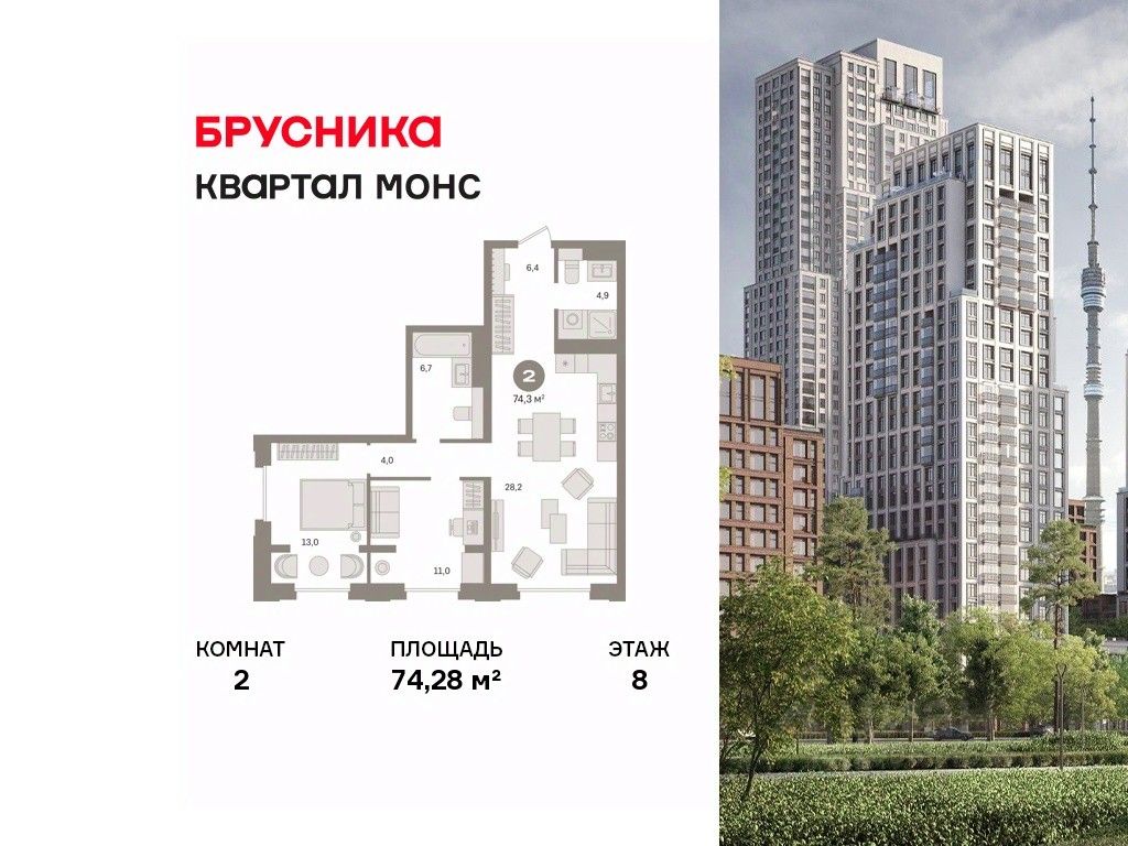 Квартира с кухней-гостиной и двумя спальнями в квартале "МОНС". Особенности планировки: окна на две стороны, второй санузел, рабочий кабинет, предчистовая отделка.