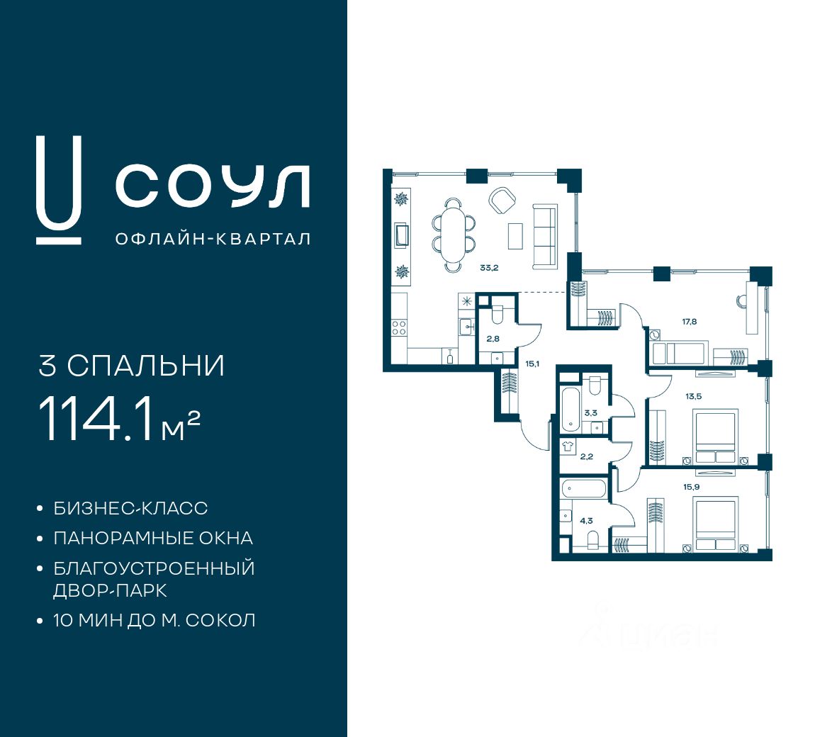 Продается 3-к. квартира номер 715 общей площадью 114.1 кв.м. на 29-м этаже 29 этажного дома, Корпус 5. Без отделки.