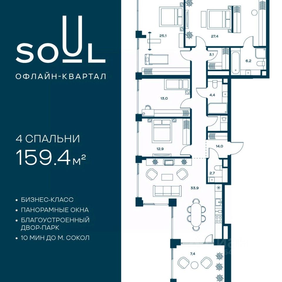 Продается 4-к. квартира номер 717 общей площадью 159.4 кв.м. на 29-м этаже 29 этажного дома, Корпус 5. Без отделки.