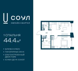 Продается 1-к. квартира номер 222 общей площадью 44.4 кв.м. на 3-м этаже 27 этажного дома, Корпус 4. С предчистовой отделкой.