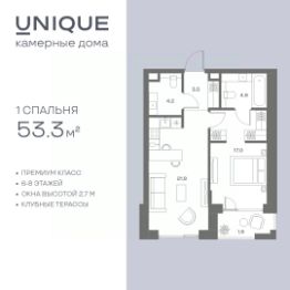 Продается 1-к. квартира квартира номер 838 общей площадью 53.3 кв.м. на 2-м этаже 8 этажного дома, корпус UNIQUE (премиум-класс). Без отделки.