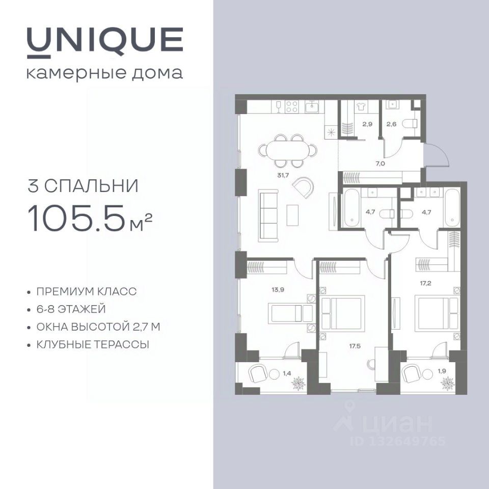 Продается 3-к. квартира квартира номер 839 общей площадью 105.5 кв.м. на 2-м этаже 8 этажного дома, корпус UNIQUE (премиум-класс). Без отделки.