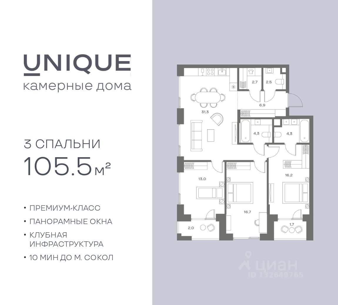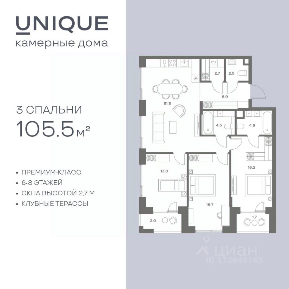Продается 3-к. квартира номер 839 общей площадью 105.5 кв.м. на 2-м этаже 8 этажного дома, корпус UNIQUE (премиум-класс). Без отделки.
