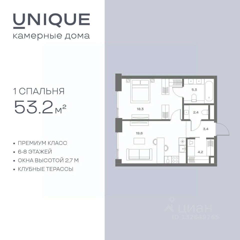 Продается 1-к. квартира квартира номер 840 общей площадью 53.2 кв.м. на 2-м этаже 8 этажного дома, корпус UNIQUE (премиум-класс). Без отделки.