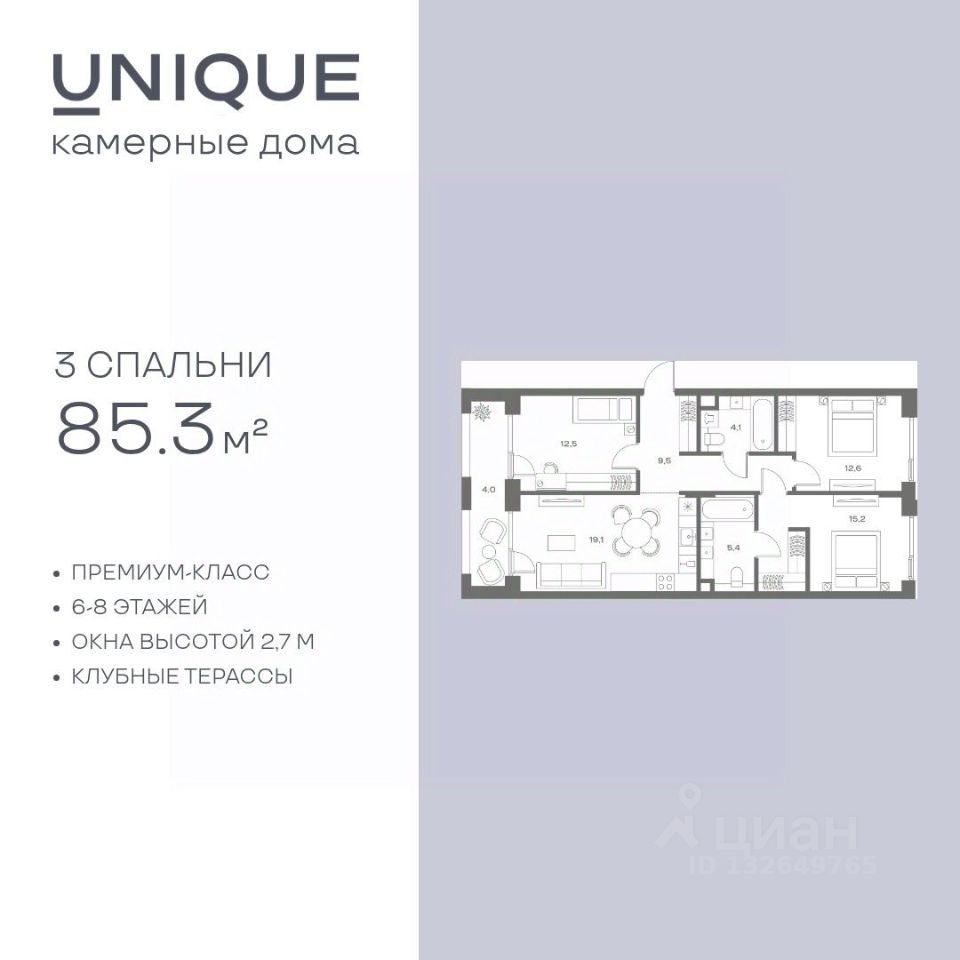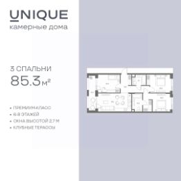 Продается 3-к. квартира номер 778 общей площадью 85.3 кв.м. на 2-м этаже 7 этажного дома, корпус UNIQUE (премиум-класс). Без отделки.