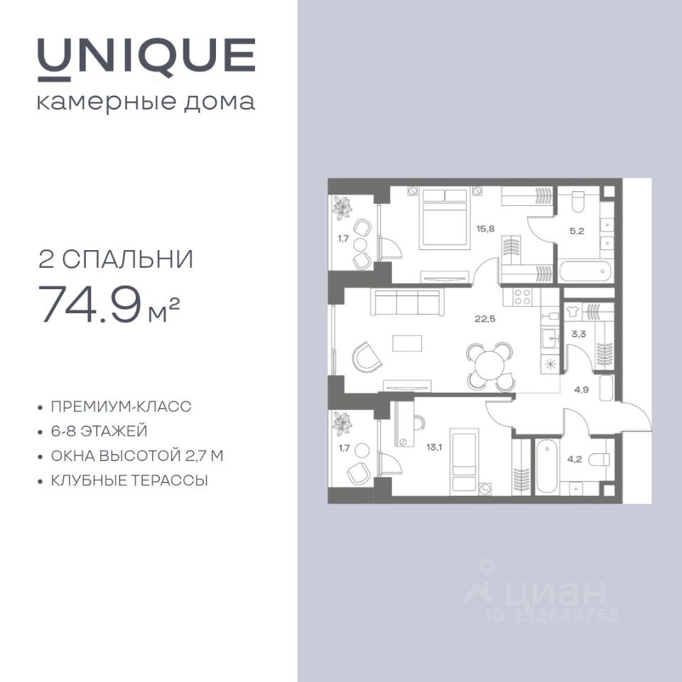 Продается 2-к. квартира номер 800 общей площадью 74.9 кв.м. на 2-м этаже 8 этажного дома, корпус UNIQUE (премиум-класс). С дизайнерской отделкой.