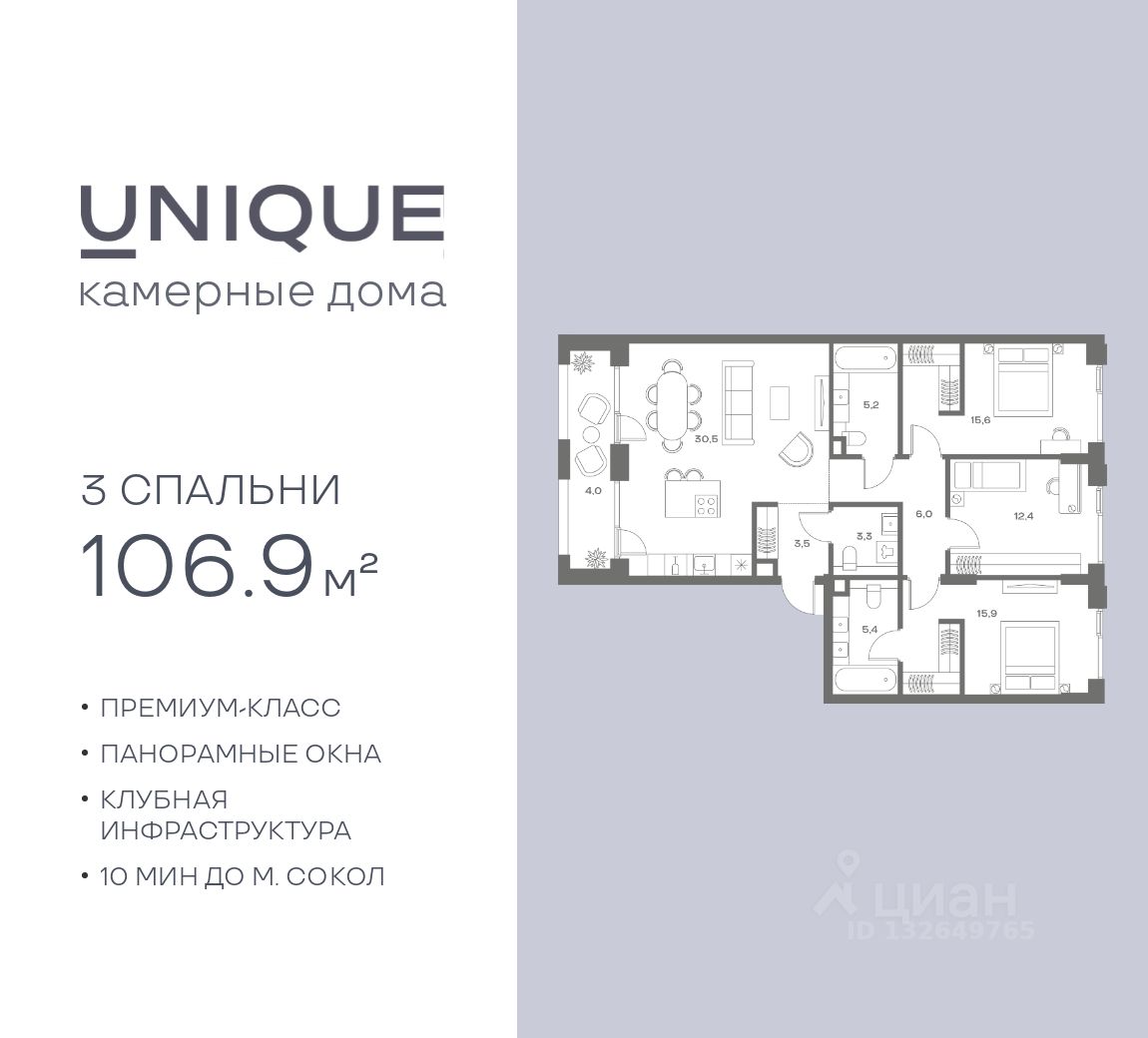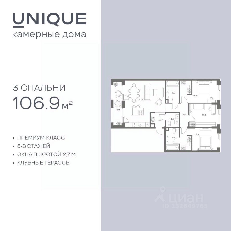 Продается 3-к. квартира номер 826 общей площадью 106.9 кв.м. на 3-м этаже 6 этажного дома, корпус UNIQUE (премиум-класс). Без отделки.