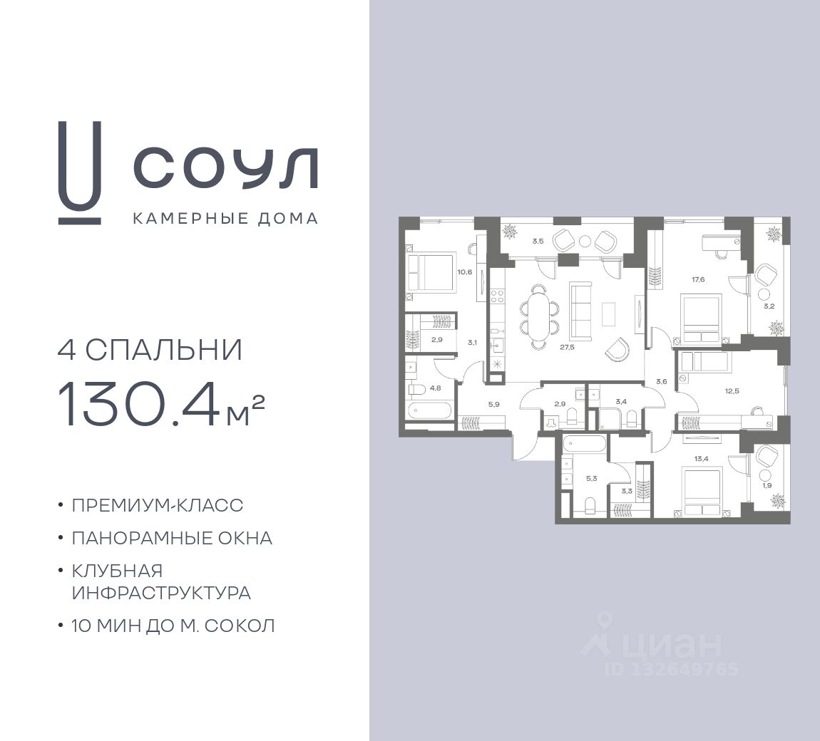 Продается 4-к. квартира номер 743 общей площадью 130.4 кв.м. на 2-м этаже 8 этажного дома, камерные дома СОУЛ (премиум-класс). Без отделки.