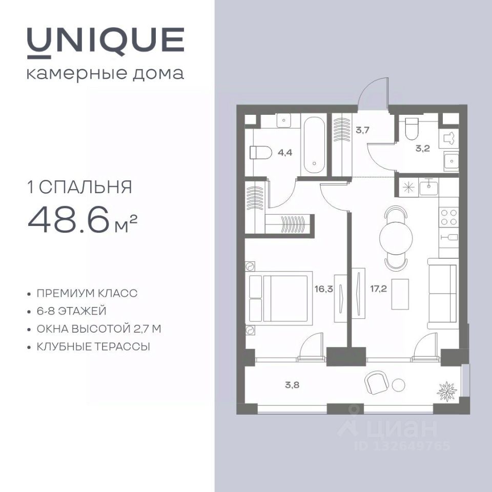 Продается 1-к. квартира квартира номер 824 общей площадью 48.6 кв.м. на 2-м этаже 6 этажного дома, корпус UNIQUE (премиум-класс). Без отделки.